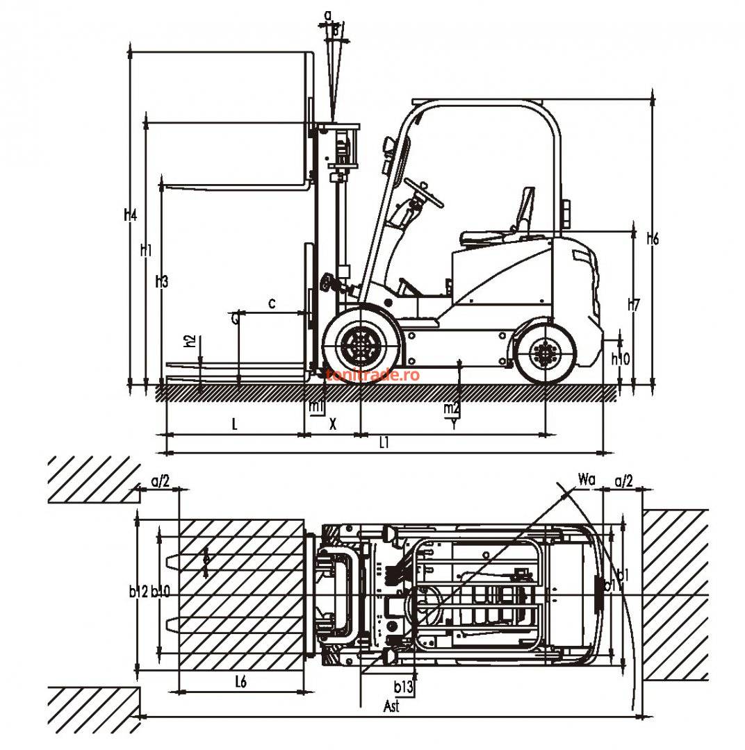 Brand Endress Power Model electrostivuitor CPD15FJ5 Tip putere Electrica Capacitate nominală kg 1500 Centru încărcare mm 500 DIMENSIUNI Înălțime ridicare h3 mm 3000 Înălțime ridicare liberă h2 mm 120 Dimensiuni furcă s/e/l mm 920x100x40 Clasa catarg 2A Latime support furci b3 mm 1085 Domeniu de înclinare a catargului F/S 6/10 grade DIMENSIUNI TOTALE: Lungime totală l1 mm 3085 Lungime totală (fara furci) l2 mm 2165 Lățimea totală b1/b2 mm 1080/1070 Înălțime catarg coborât h1 mm 2170 Înălțime catarg extins h4 mm 4010 Înălțime carcasă protecție h6 mm 2170 Înălțime scaun h7 mm 1160 Raza de întoarcere Wa mm 2060 PERFORMANȚE Viteza mers (încărcat/descarcat) km/h 12/12.5 Viteza ridicare (încărcat/descarcat) m/s 0.25/0.45 Viteza coborâre (încărcat/descarcat) m/s 0.45/0.44 Sarcină maximă bară de tracțiune N 11000 Gradeabilitate maxima , inc./desc. % 10.5/14 SASIU Tip anvelope Pneumatice Anvelope față 6.50-10-10PR Anvelope spate 5.00-8-10PR Cale de rulare față b10 mm 890 Cale de rulare spate b11 mm 920 Ampatament mm 1410 Garda la sol minima, sub catarg m1 mm 110 Garda la sol m2 mm 110 Greutate proprie kg 2670 Frana de serviciuHidraulica + mecanica Frana de parcareMecanica MOTOR ELECTRIC Putere motor electric acționare S2 60 min. kW 6 Putere motor ridicare S3 15% kW 7.5 Tensiune baterie / capacitate nominală K5 V/Ah 48/385 Incarcator V/A 48/50 Greutate baterie kg 660 DATE SUPLIMENTARE Tip acționare AC Nivel sonor la nivelul urechii operatorului dB(A) 70 Garantie: 12 luni persoane juridice 24 luni persoane fizice |
