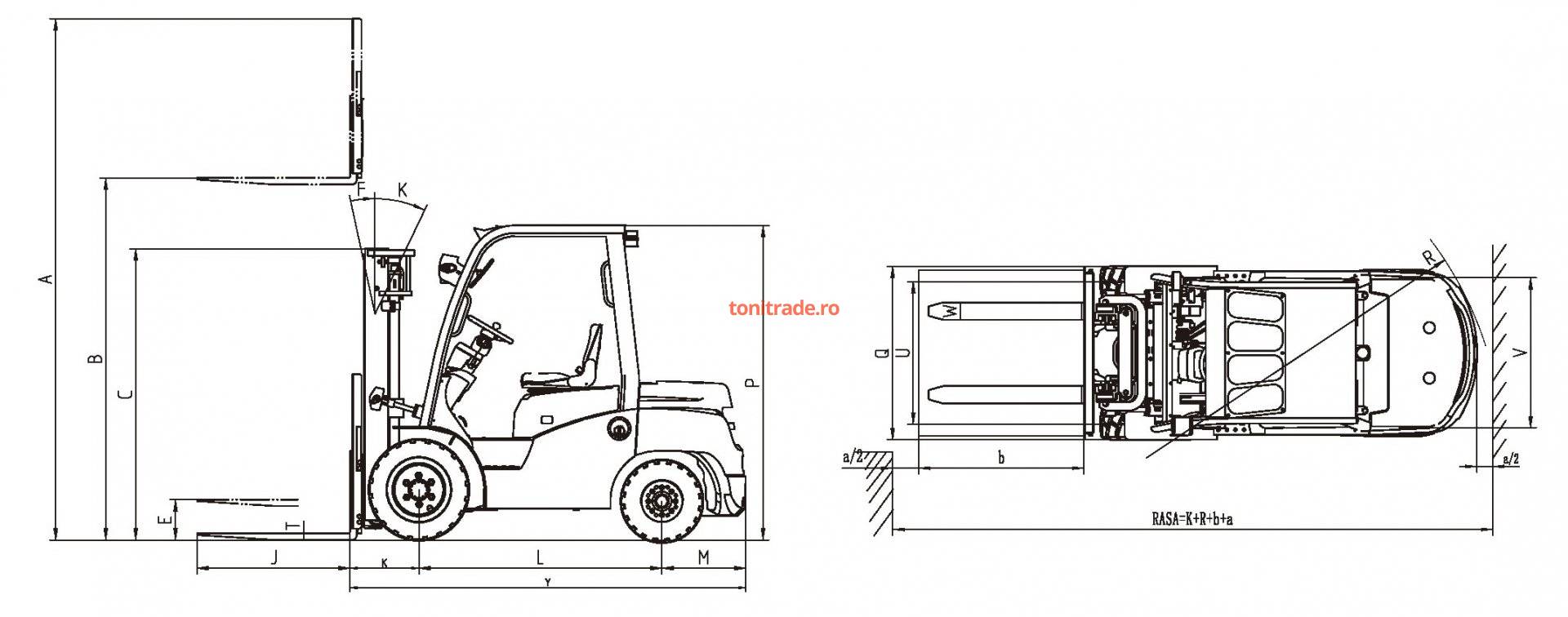 Capacitate ridicare 2000 kg Centru incarcare 500 mm Dimensiuni furciL x l x h: 1070x120x40 mm Domeniu de înclinare a catargului F/S : 6/12 grade Lungime totală 2610 mm Lățimea totală 1150 mm Înălțime catarg coborât 1995 mm Înălțime catarg extins 4200 mm Înălțime carcasă protecție 2130 mm Raza de întoarcere (exterioară) 2170 mm Mers (fără încărcare) 20 km/h Ridicare (încărcare max.) 450 mm/sec Coborâre (încărcare max.) 450 mm/sec Anvelope față 7.00-12-12PR Anvelope spate 6.00-9-10PR Garda la sol : 120 mm Greutate proprie 3580 kg Baterie: tensiune/capacitate (20h) V/Ah 12/60